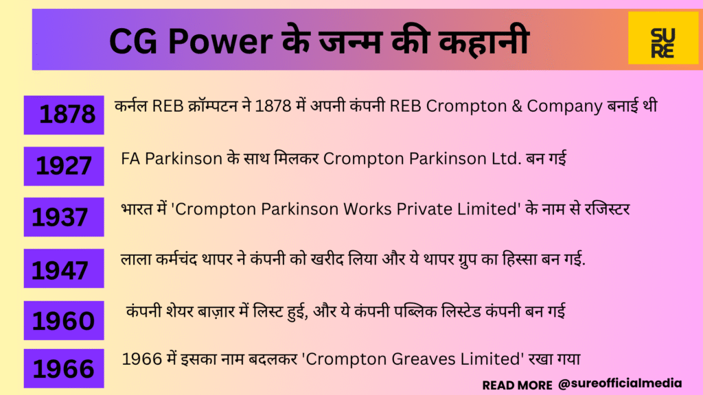 CG Power की जड़ें 19वीं सदी के इंग्लैंड में हैं. कर्नल REB क्रॉम्पटन ने 1878 में अपनी कंपनी REB Crompton & Company बनाई थी. 1927 में ये कंपनी FA Parkinson के साथ मिलकर Crompton Parkinson Ltd. बन गई. भारत में इसके कदम Greaves Cotton & Company के ज़रिए पड़े, जो इसकी भारतीय एजेंट थी.