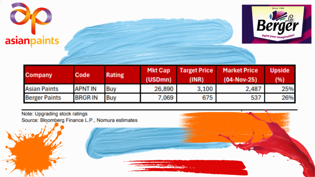 नोमुरा ने एशियन पेंट्स को ‘Neutral’ से अपग्रेड करके ‘Buy’ की रेटिंग कर दी है और इसका टारगेट प्राइस भी बढ़ाकर 2,285 रुपये से बढ़ाकर 3,100 रुपये कर दिया है, जो कि 4 नवंबर के क्लोजिंग प्राइस से 25% अपसाइड है. बर्जर पेंट्स की रेटिंग को ‘Reduce’ से अपग्रेड करके ‘Buy’ की रेटिंग कर दी है और टारगेट प्राइस को 500 रुपये से बढ़ाकर 675 रुपये कर दिया है. जो कि 4 नवंबर के क्लोजिंग प्राइस से 26% अपसाइड को दिखाता है.