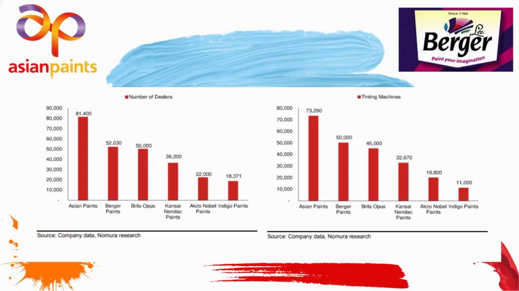 नोमुरा ने अपनी रिपोर्ट में इस बात पर जोर दिया है कि डिस्ट्रीब्यूशन नेटवर्क भारत की पेंट इंडस्ट्री की रीढ़ बना हुआ है. एशियन पेंट्स अपने 10 प्लांट्स में लगभग 2,335 किलोलीटर वार्षिक डेकोरेटिव पेंट उत्पादन क्षमता के साथ सबसे आगे है. जबकि बर्जर पेंट्स अपने 8 प्लांट्स में 1,500 किलोलीटर उत्पादन क्षमता के साथ दूसरे नंबर पर है.