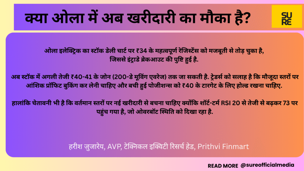 ओला इलेक्ट्रिक का स्टॉक डेली चार्ट पर ₹34 के महत्वपूर्ण रेजिस्टेंस को मजबूती से तोड़ चुका है, जिससे इंट्राडे ब्रेकआउट की पुष्टि हुई है. अब स्टॉक में अगली तेजी ₹40-41 के जोन (200-डे मूविंग एवरेज) तक जा सकती है. ट्रेडर्स को सलाह है कि मौजूदा स्तरों पर आंशिक प्रॉफिट बुकिंग कर लेनी चाहिए और बची हुई पोजीशन्स को ₹40 के टारगेट के लिए होल्ड रखना चाहिए. हालांकि चेतावनी भी है कि वर्तमान स्तरों पर नई खरीदारी से बचना चाहिए क्योंकि शॉर्ट-टर्म RSI 20 से तेजी से बढ़कर 73 पर पहुंच गया है, जो ओवरबॉट स्थिति को दिखा रहा है.