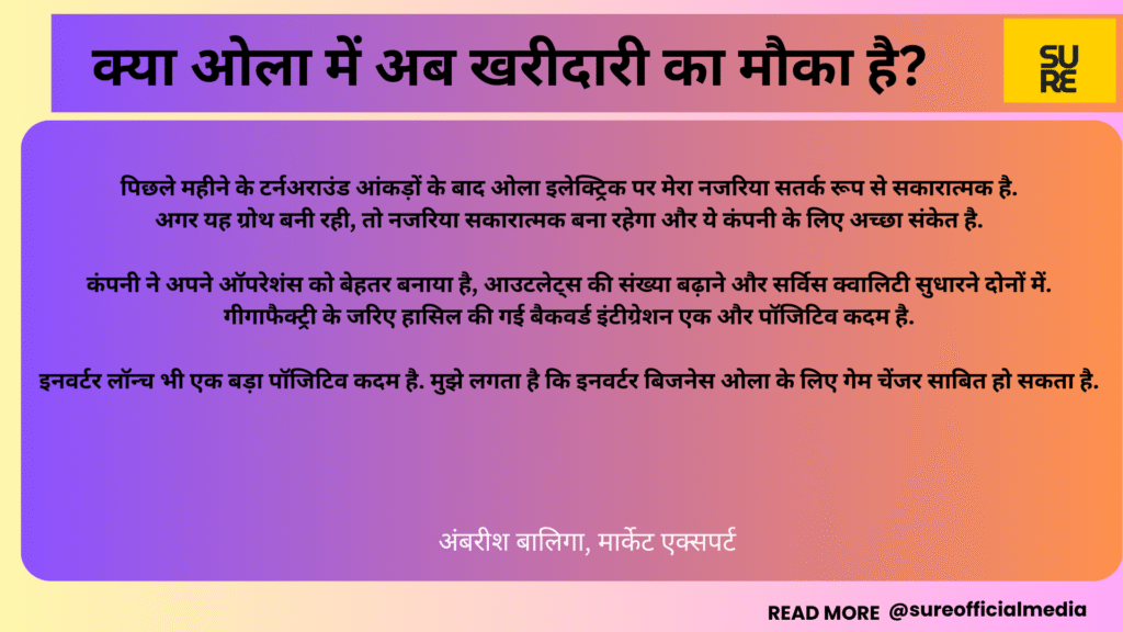 ओला को लेकर जो भी कुछ हो रहा है, ये एक पॉजिटिव संकेत हैं कि आखिरकार ओला इलेक्ट्रिक चुनौतियों से निपटने में और खराब व्यवस्थाओं को सुधारने में कामयाब हो रही है और बाजार भी इस बात को साफ तौर पर मान रहा है. तो अब सवाल यही कि ओला इलेक्ट्रिक में आई तेज़ी के बाद क्या इसमें अब खरीदारी का मौका है. इसे लेकर एनालिस्ट्स का अलग-अलग नज़रिया है.