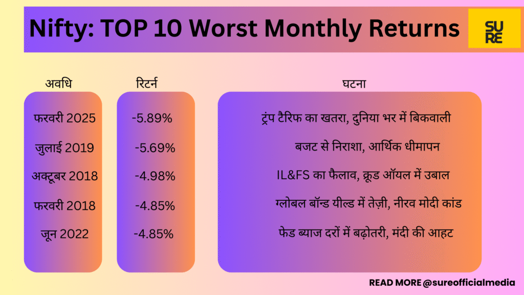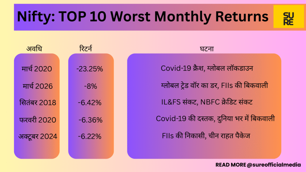 अगर पूरे महीने पर नज़र डालें तो निफ्टी इस महीने अबतक 8% से ज्यादा टूट चुका है. जबकि अभी आधा महीना बाकी है. अगर गिरावट इसी तरह जारी रहती है तो यह गिरावट मार्च 2020 के कोविड क्रैश के बाद सबसे बड़ी मासिक गिरावटों में शामिल हो सकती है. एक नज़र बीते 10 सालों के दौरान निफ्टी की टॉप-10 मंथली गिरावटों पर